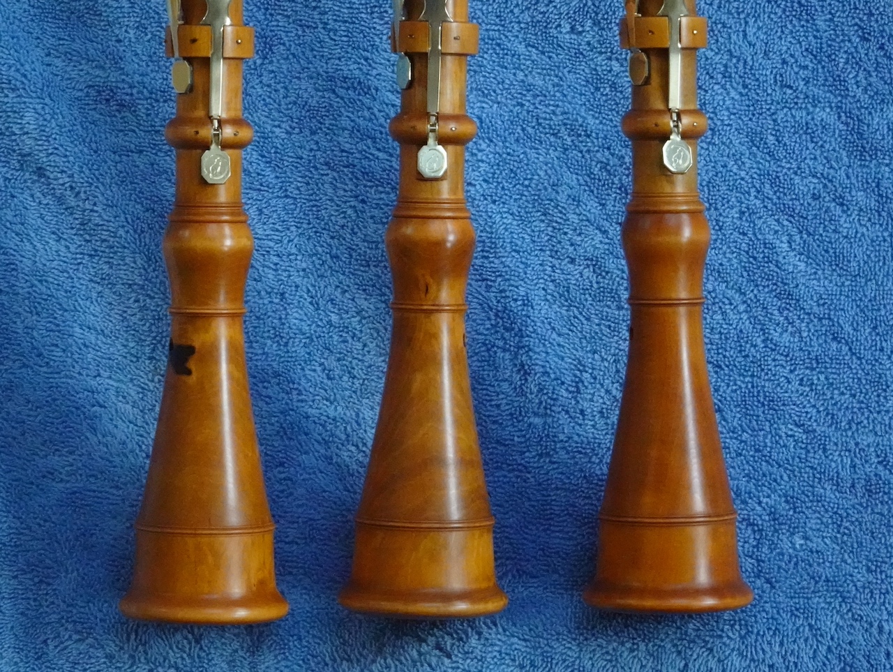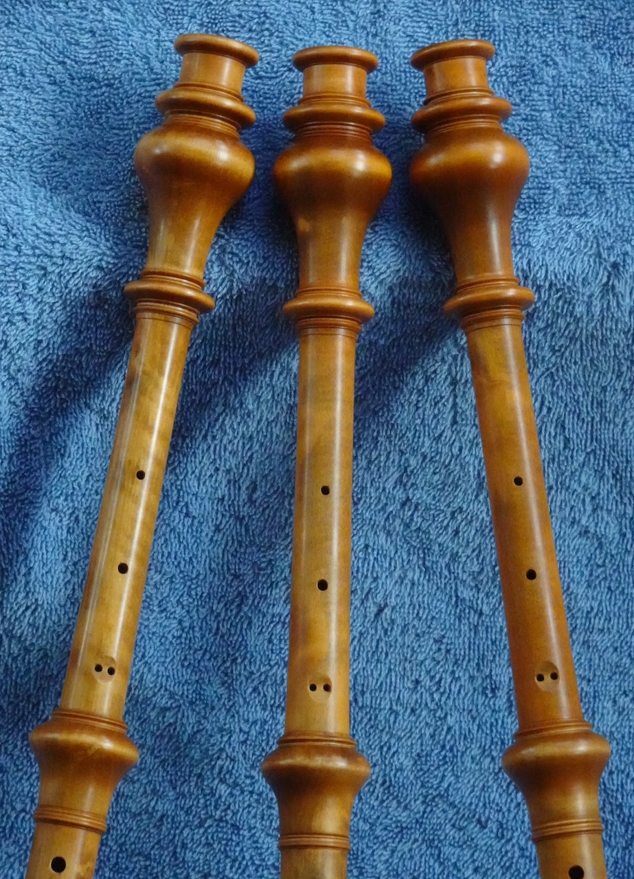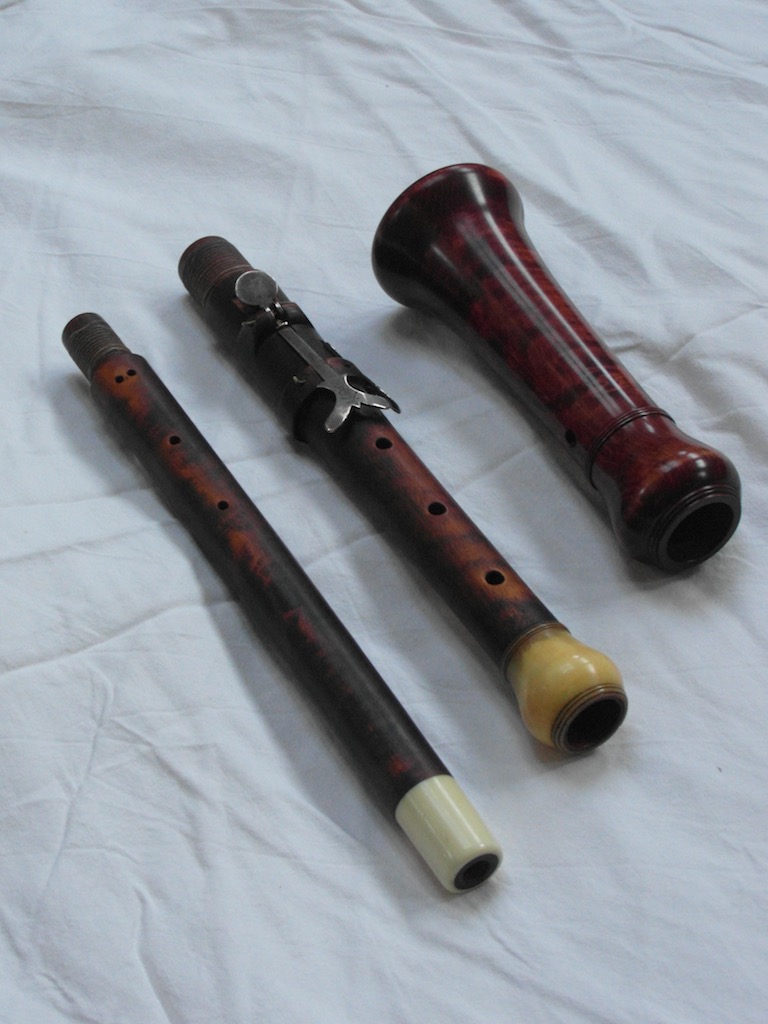 Zo heb ik voor een vriend van wie de beker van een originele oude hobo (rechts) van de bouwer Thomas Cahusac senior gestolen was, een nieuwe beker gemaakt, uitgaande van de meetgegevens die hij er gelukkig van had. Er had eigenlijk een ivoren ring op gemoeten. Tja. Maar het treffen van de goede kleur is goed gelukt.