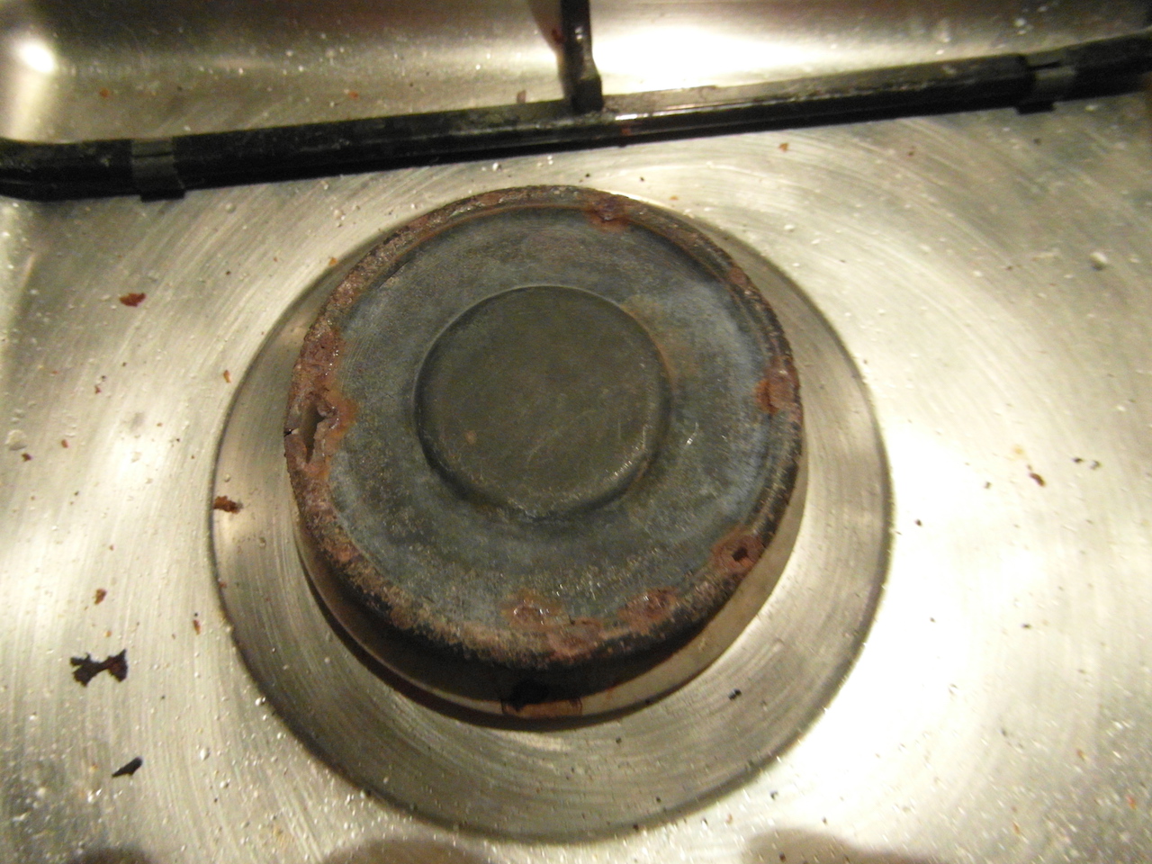En nu -dat wil zeggen: een paar jaar terug- begon het fornuis een mankement te vertonen: de branderdeksels (de metalen plaatjes bovenop de branders) bleken langzaam door de hitte verteerd te worden.