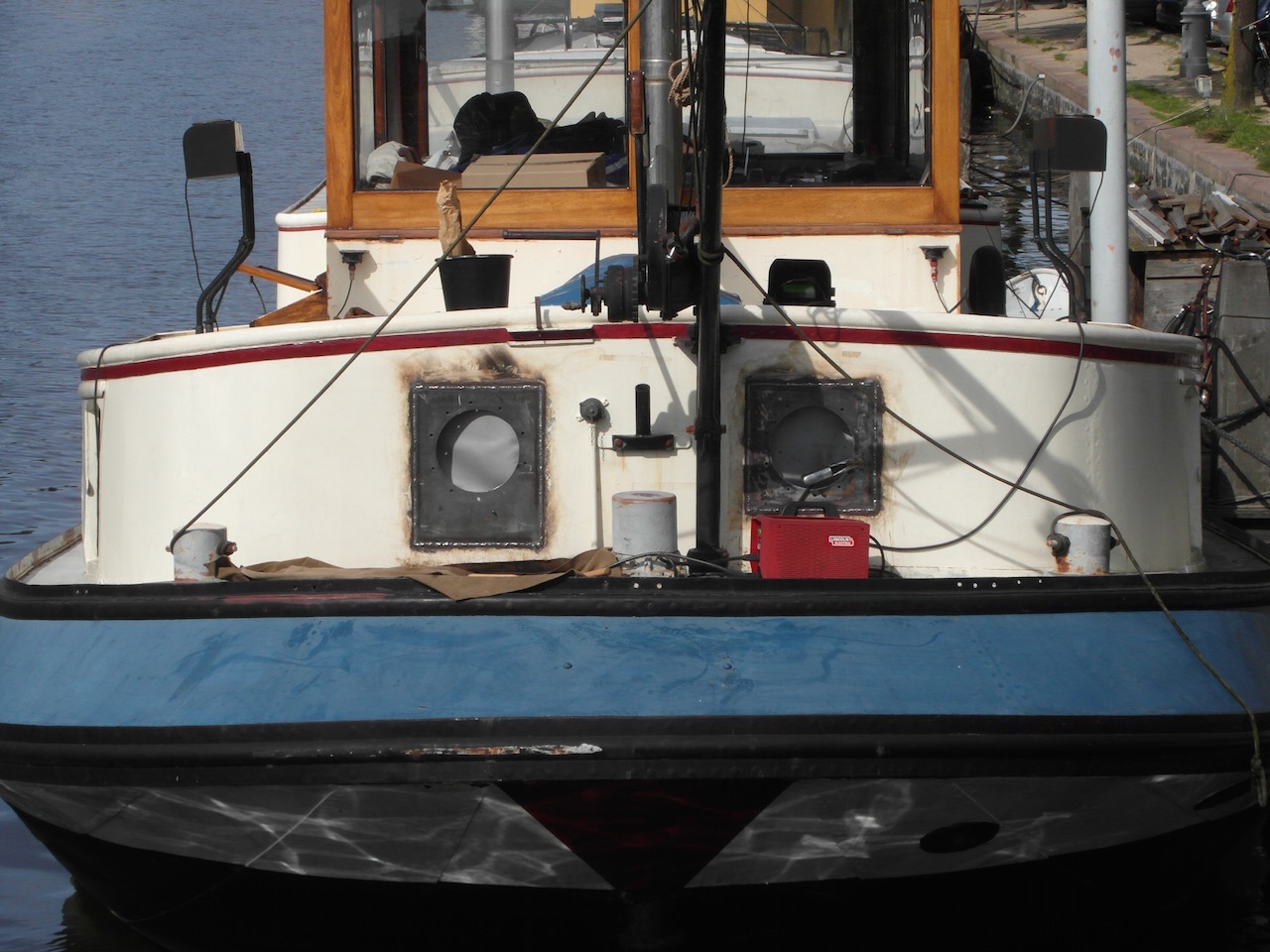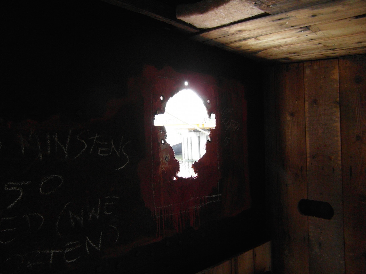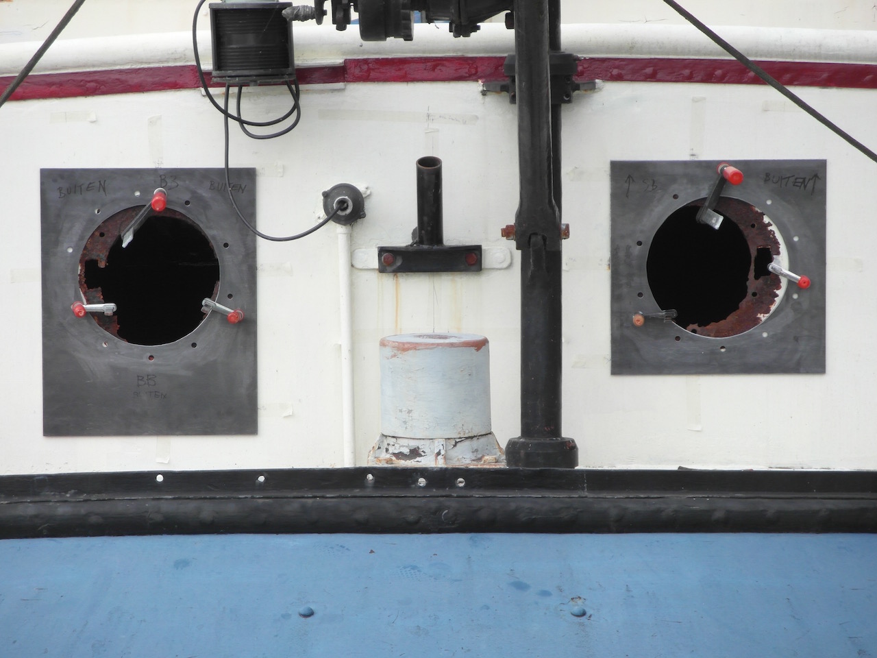 In de achterwand van de roef, het achteronder, van het goede schip Spes, waar ik op woon, zaten twee patrijspoorten, die toen ik hier kwam wonen al geheel kapot waren. Er was iets ontzet, waardoor ze gebarsten waren, en waardoor de omliggende stalen wand flink dóórgeroest was.